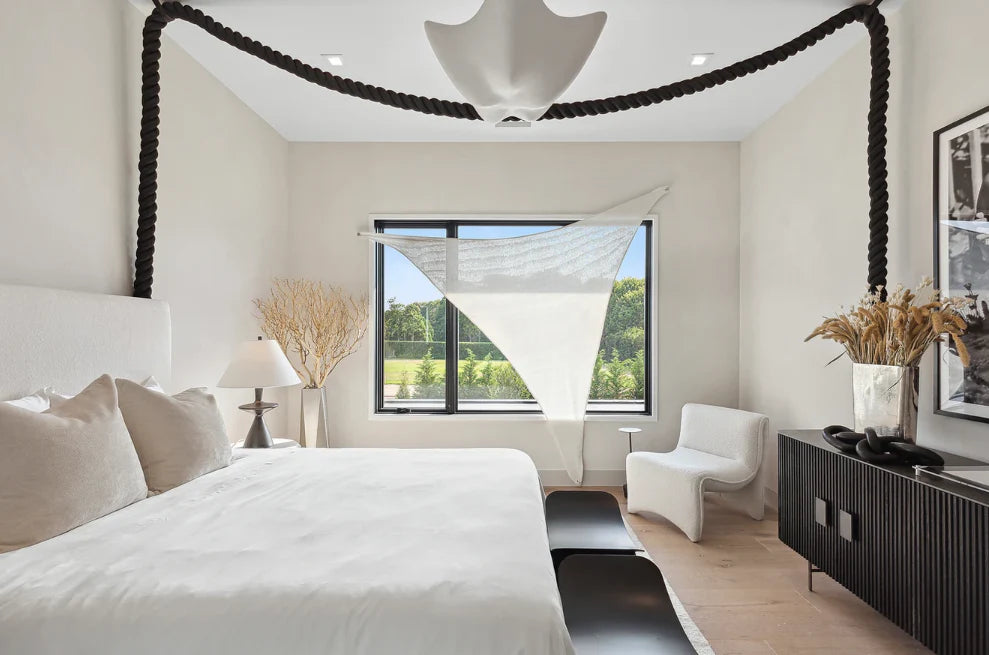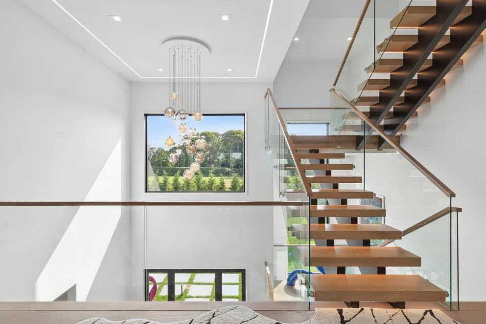 This stunning custom home built by BJC Luxury Homes features our 8" White Oak Live Sawn Beach Sand hardwood flooring. It's the perfect neutral tone with hints of white in the grain which brings warmth to the space. We love how this works with bright white walls and black windows.