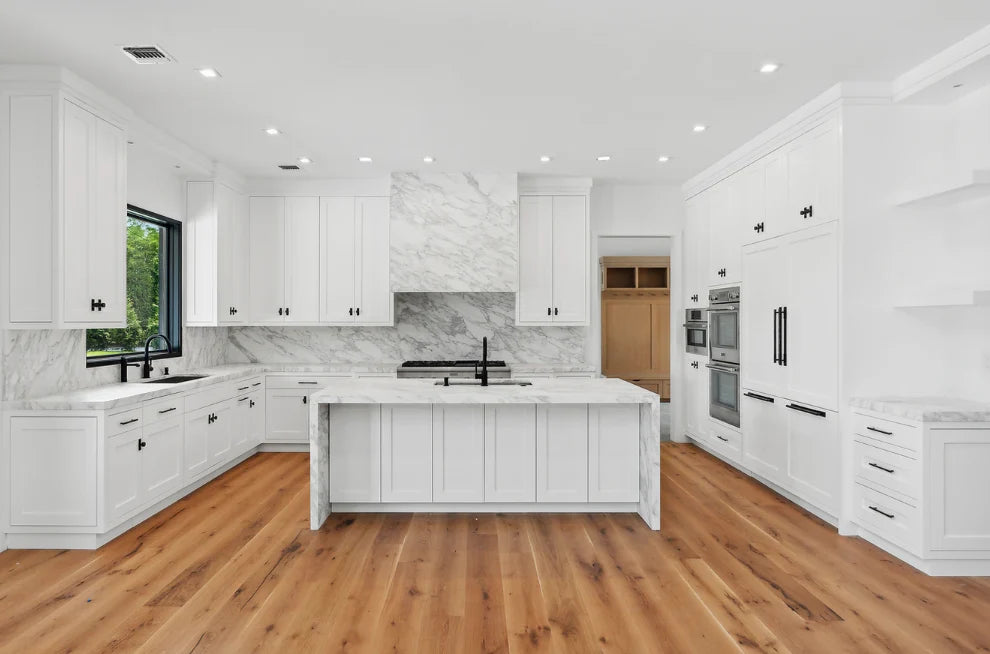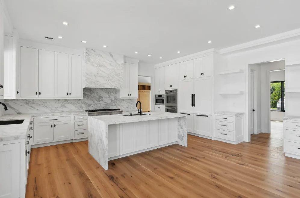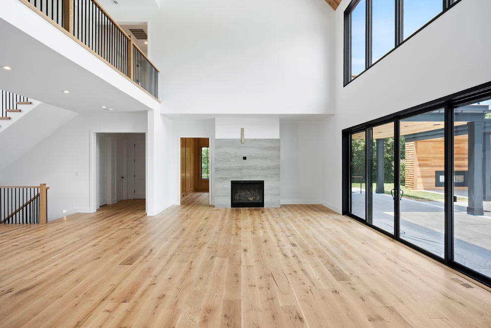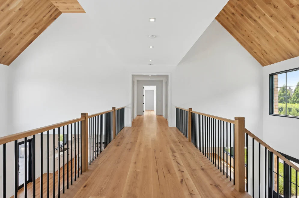 This beautifully designed custom home was built by BJC Luxury Homes and features our stunning 8" White Oak Live Sawn Natural hardwood floors.