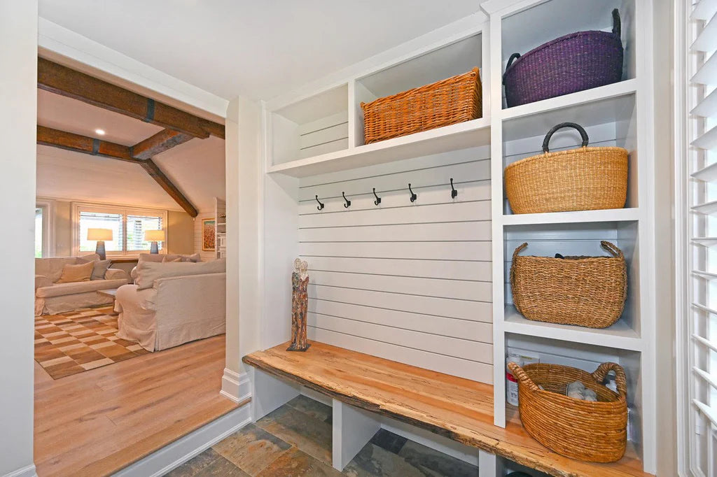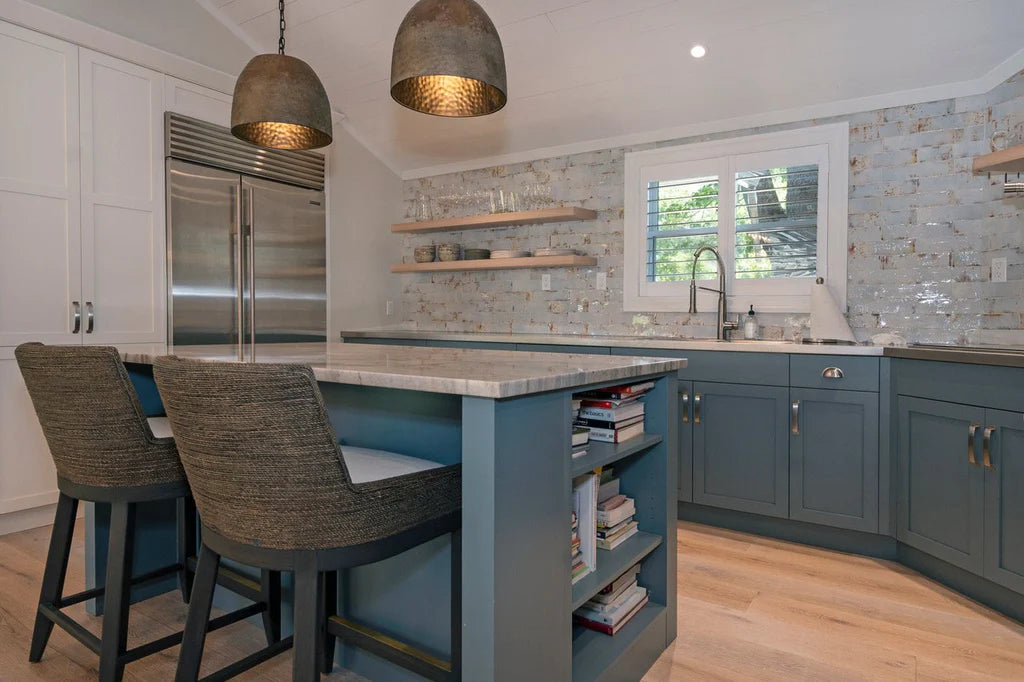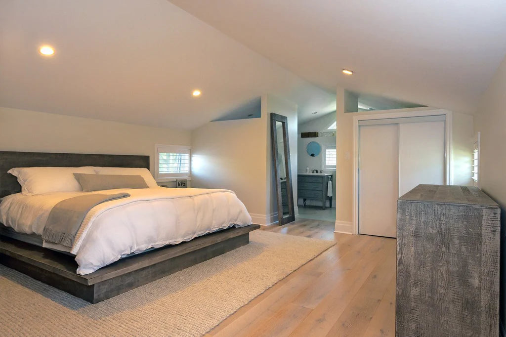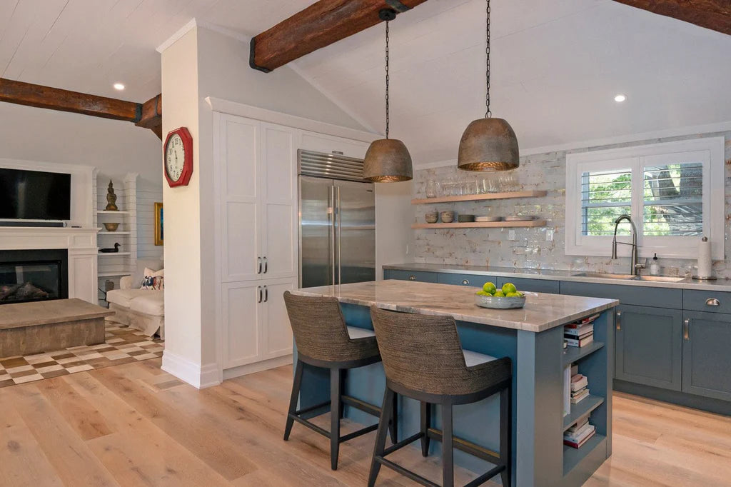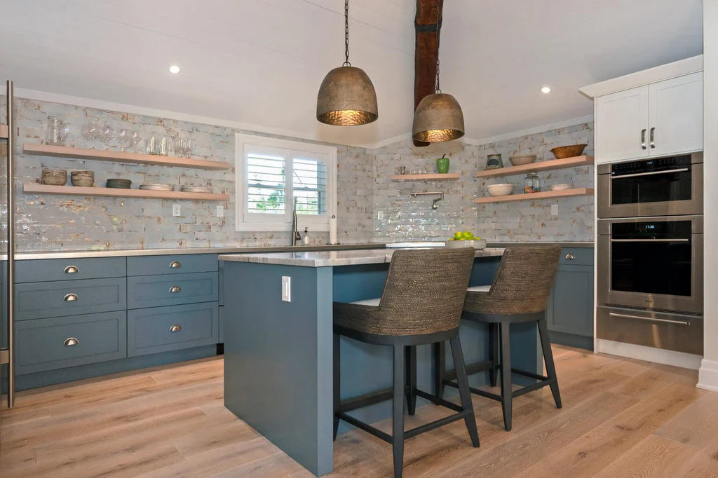 This project is a beautiful aged stone house that has been redesigned by Belinda Kelly Interiors. This stone home received lots of love and was revamped to have light, bright, coastal finishes. Our Wide Plank White Oak Champagne was installed in 8" wide planks, bringing some neutral and tones into the space. The champagne stain works beautifully to compliment wood elements in the home due to the ample variation throughout. We love Belinda's pop of colour in the cabinetry, we always feel inspired after seeing Belinda's designs.
