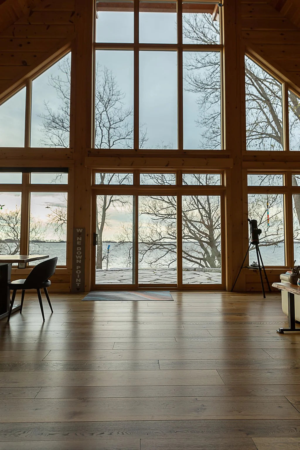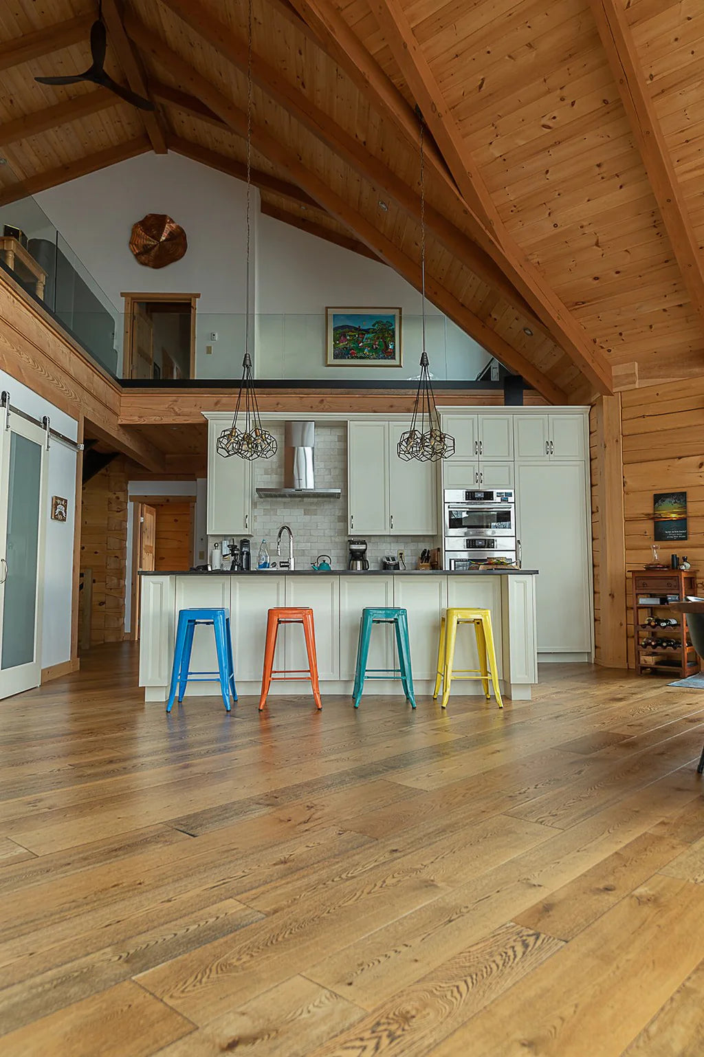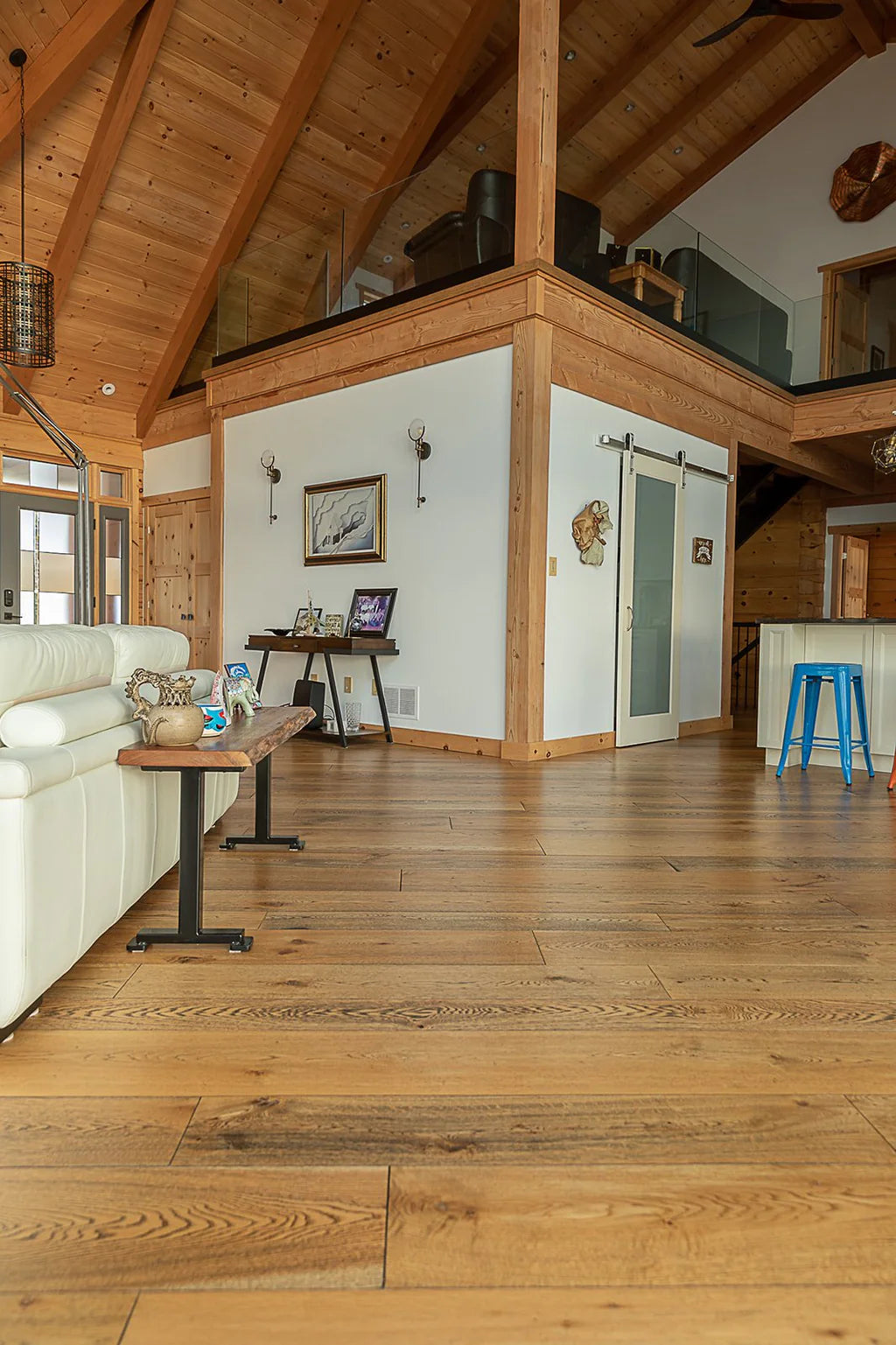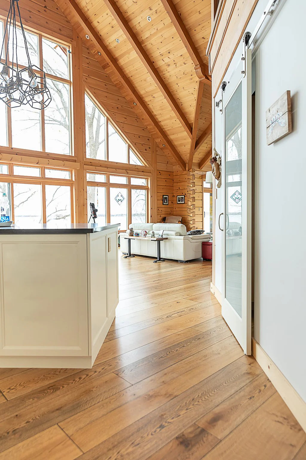 This custom log home is nestled on a beautiful waterfront property in Prince Edward County. Our Wide Plank Natural 1850 flooring is the perfect compliment to the wood elements in this home. This floor features three different widths, mixing the 6", 8", and 10" throughout to add character and a fun element of interest. This home has the extremes in humidity fluctations, it has a radiant in floor heating system and is on the waterfront making the solid livesawn white oak the perfect choice for this project.