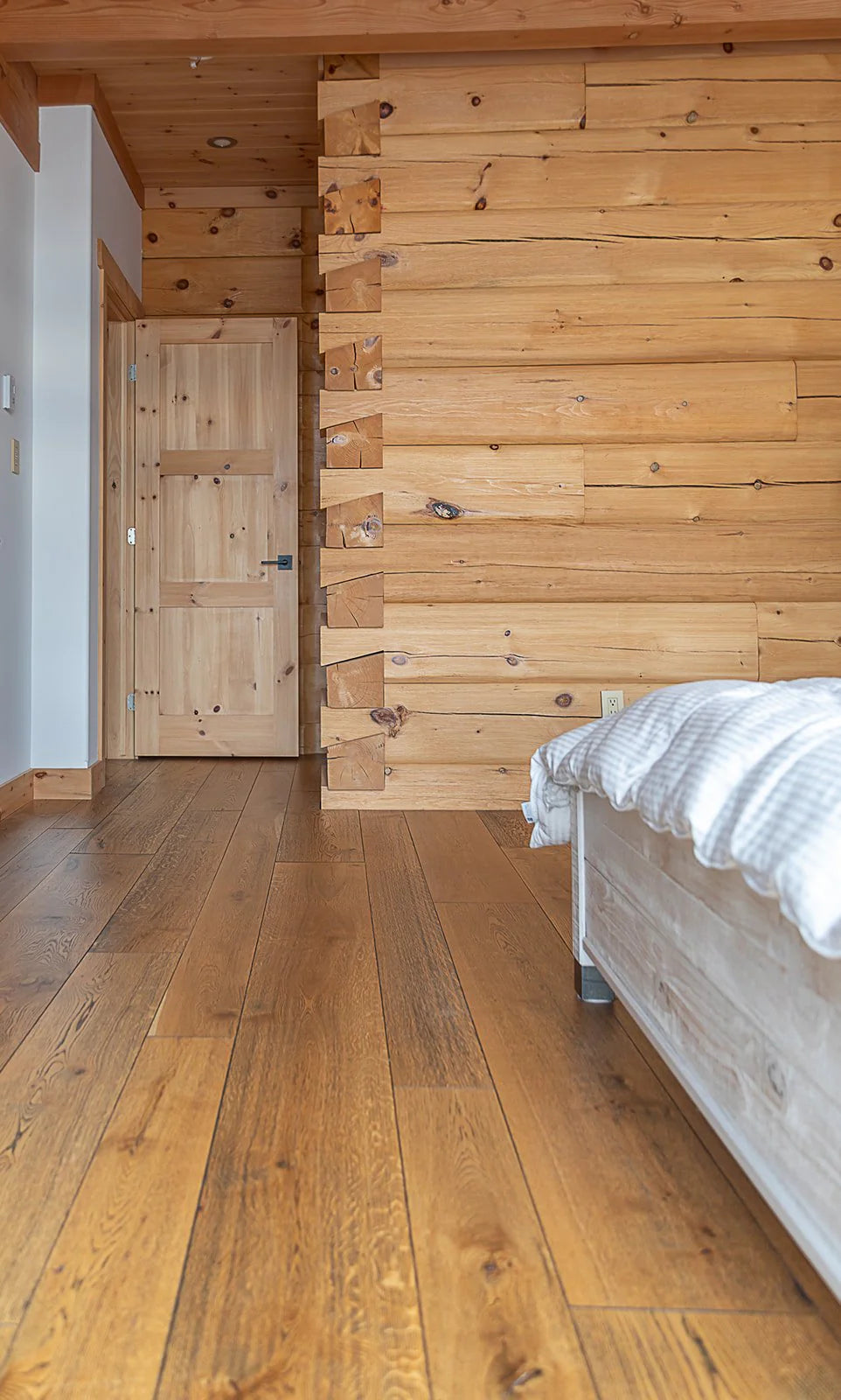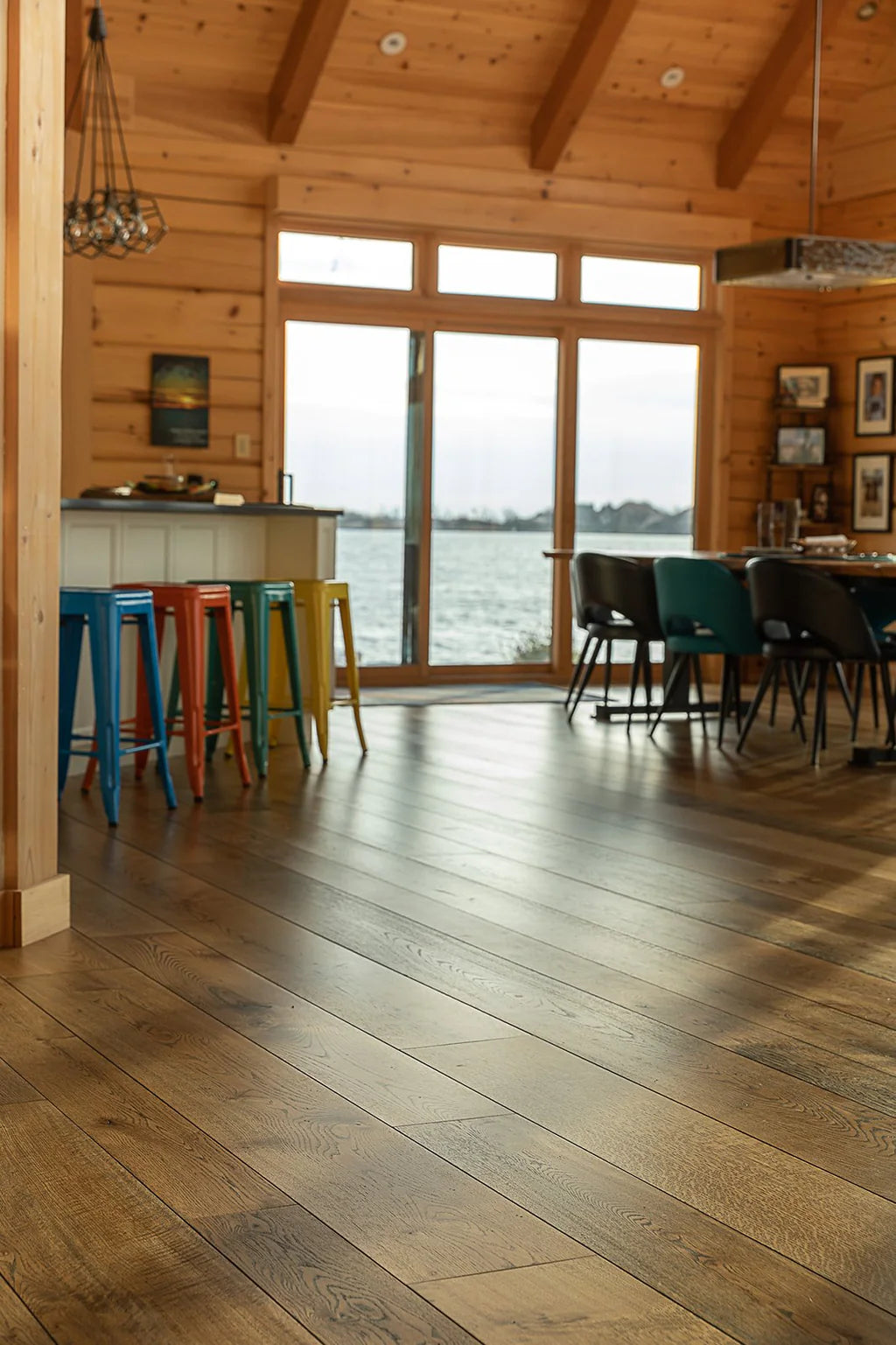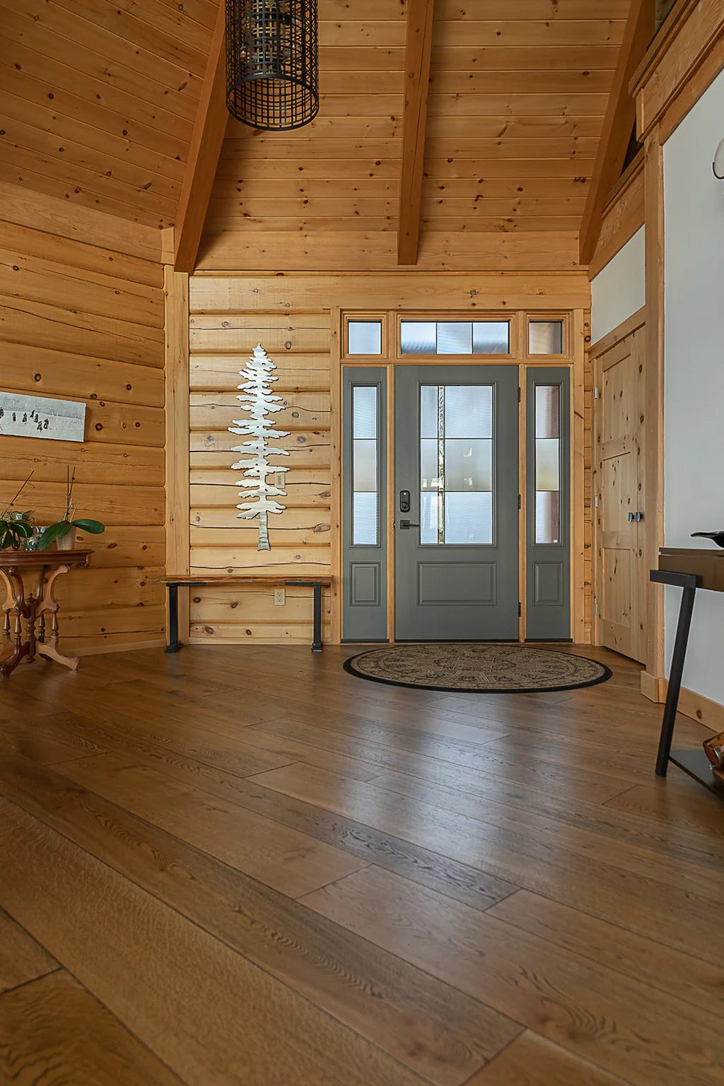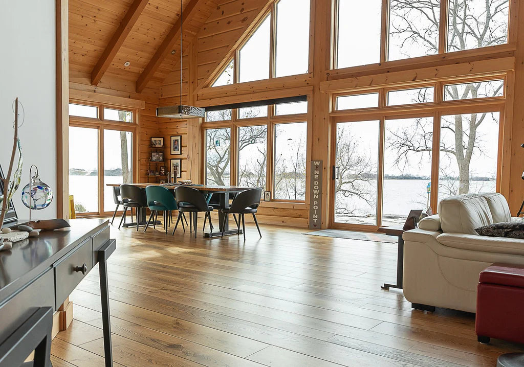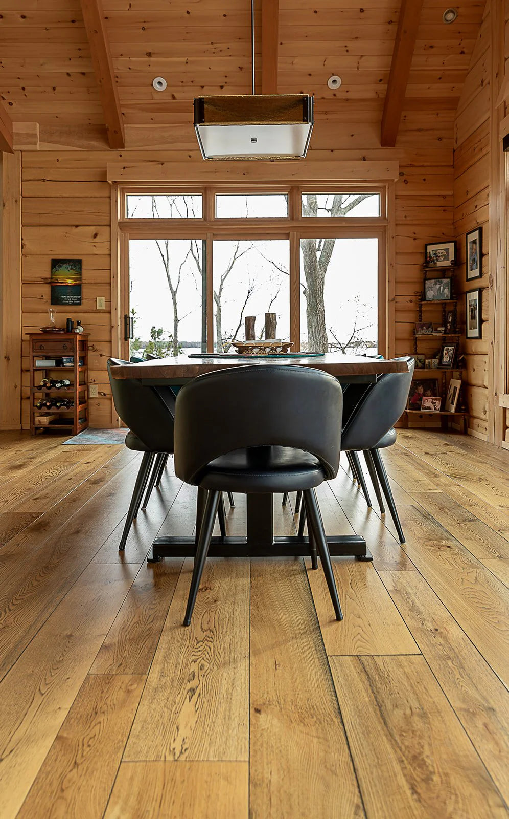 This custom log home is nestled on a beautiful waterfront property in Prince Edward County. Our Wide Plank Natural 1850 flooring is the perfect compliment to the wood elements in this home. This floor features three different widths, mixing the 6", 8", and 10" throughout to add character and a fun element of interest. This home has the extremes in humidity fluctations, it has a radiant in floor heating system and is on the waterfront making the solid livesawn white oak the perfect choice for this project.