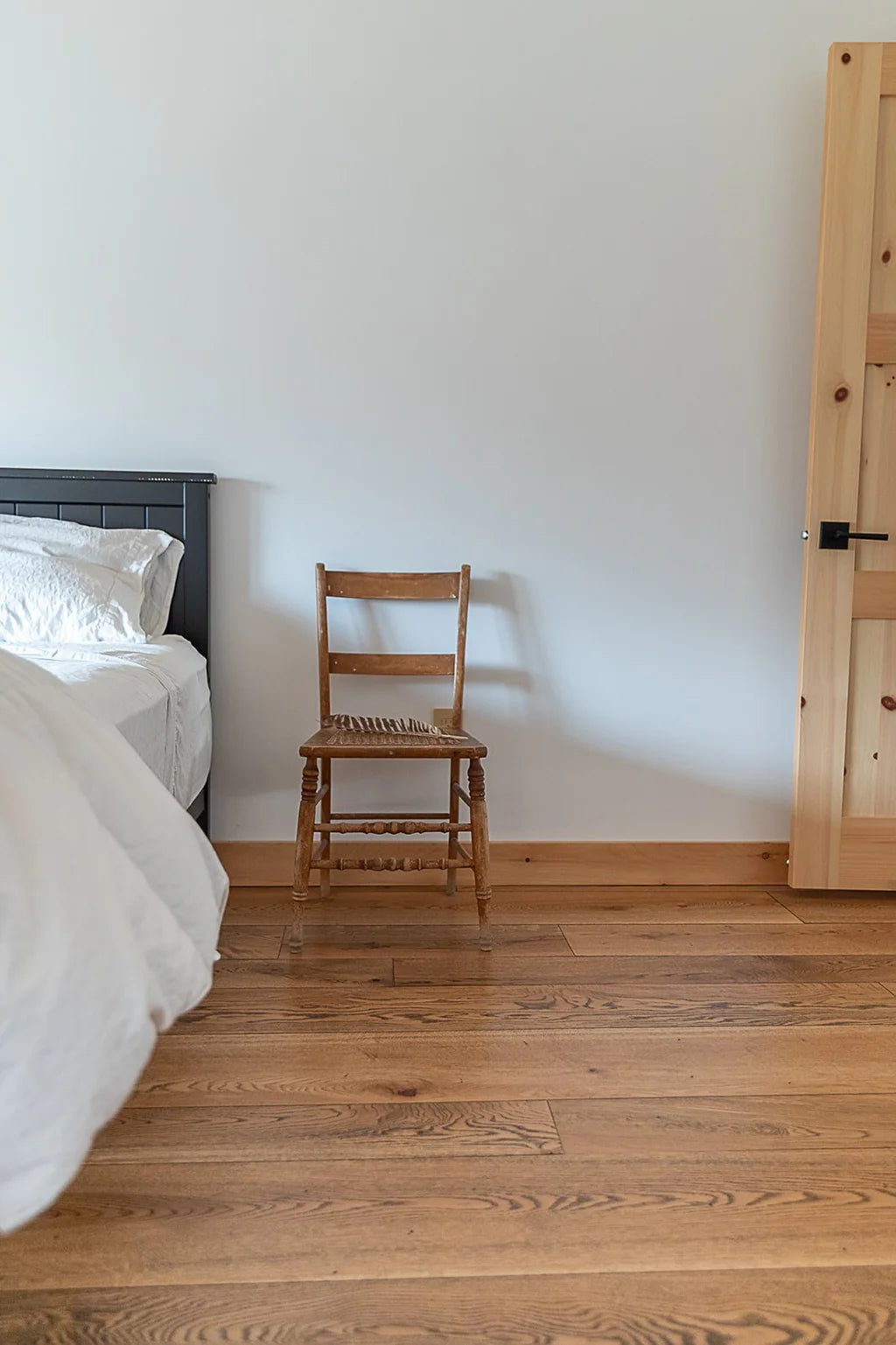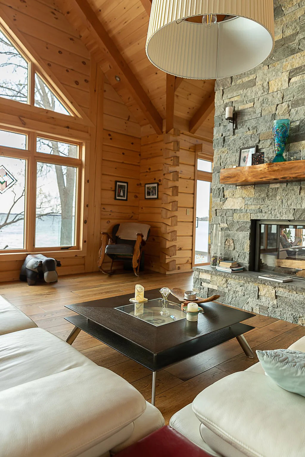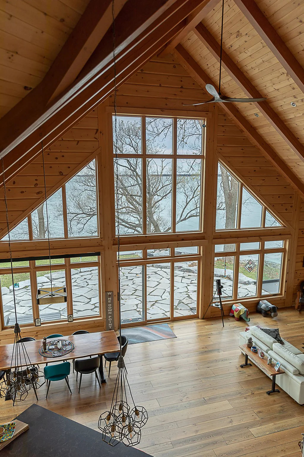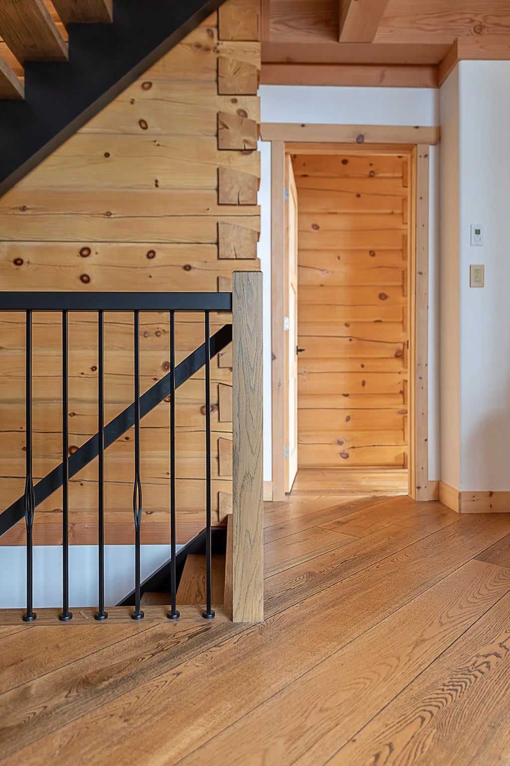 This custom log home is nestled on a beautiful waterfront property in Prince Edward County. Our Wide Plank Natural 1850 flooring is the perfect compliment to the wood elements in this home. This floor features three different widths, mixing the 6", 8", and 10" throughout to add character and a fun element of interest. This home has the extremes in humidity fluctations, it has a radiant in floor heating system and is on the waterfront making the solid livesawn white oak the perfect choice for this project.