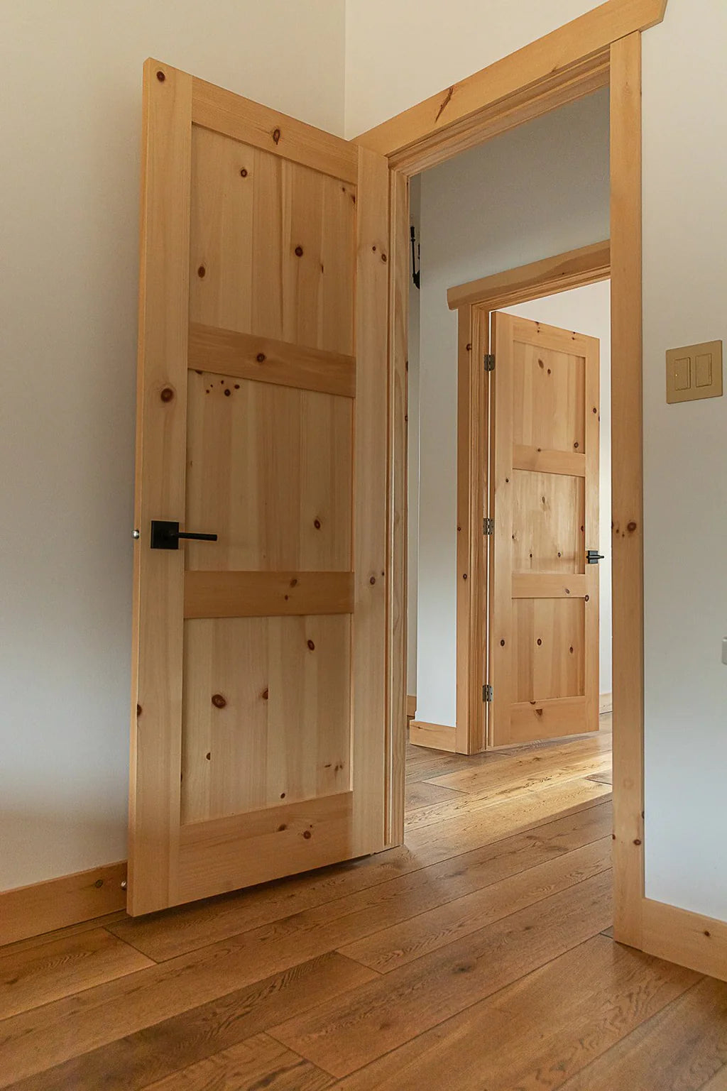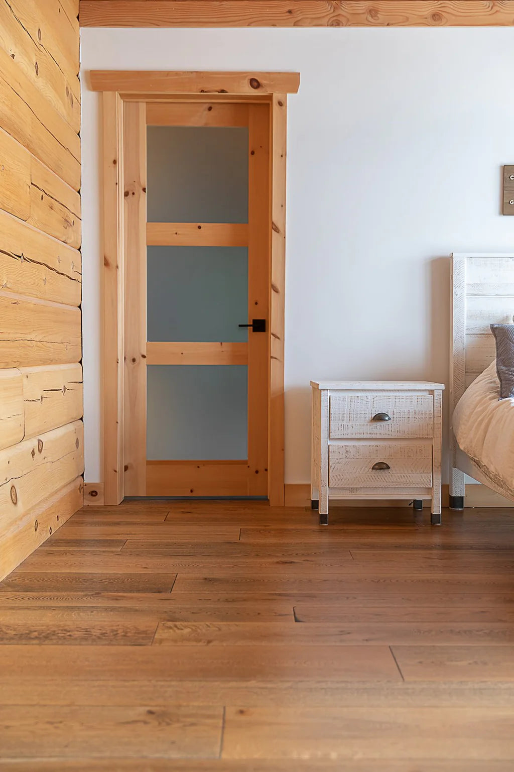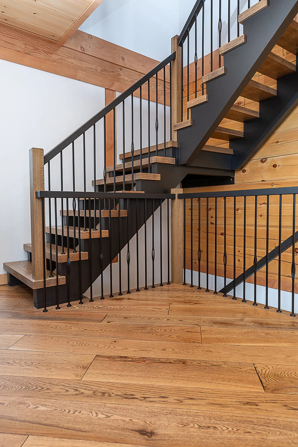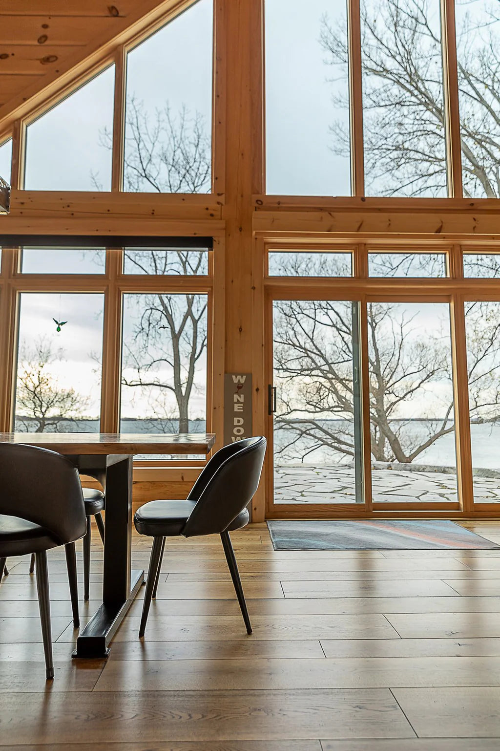This custom log home is nestled on a beautiful waterfront property in Prince Edward County. Our Wide Plank Natural 1850 flooring is the perfect compliment to the wood elements in this home. This floor features three different widths, mixing the 6", 8", and 10" throughout to add character and a fun element of interest. This home has the extremes in humidity fluctations, it has a radiant in floor heating system and is on the waterfront making the solid livesawn white oak the perfect choice for this project.