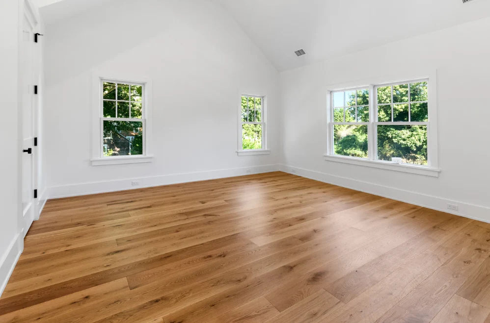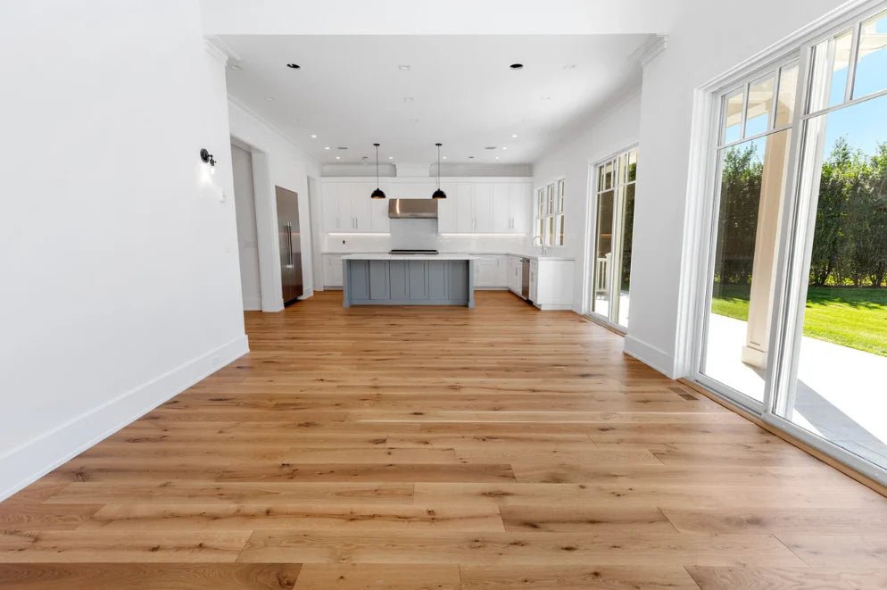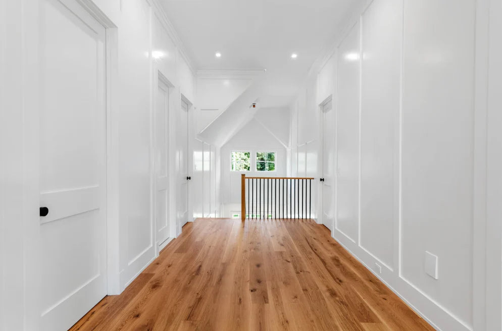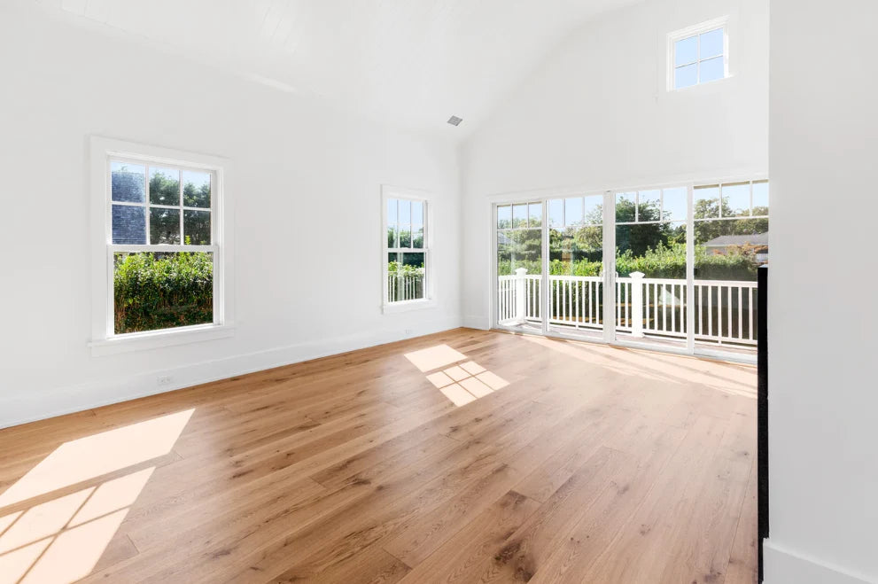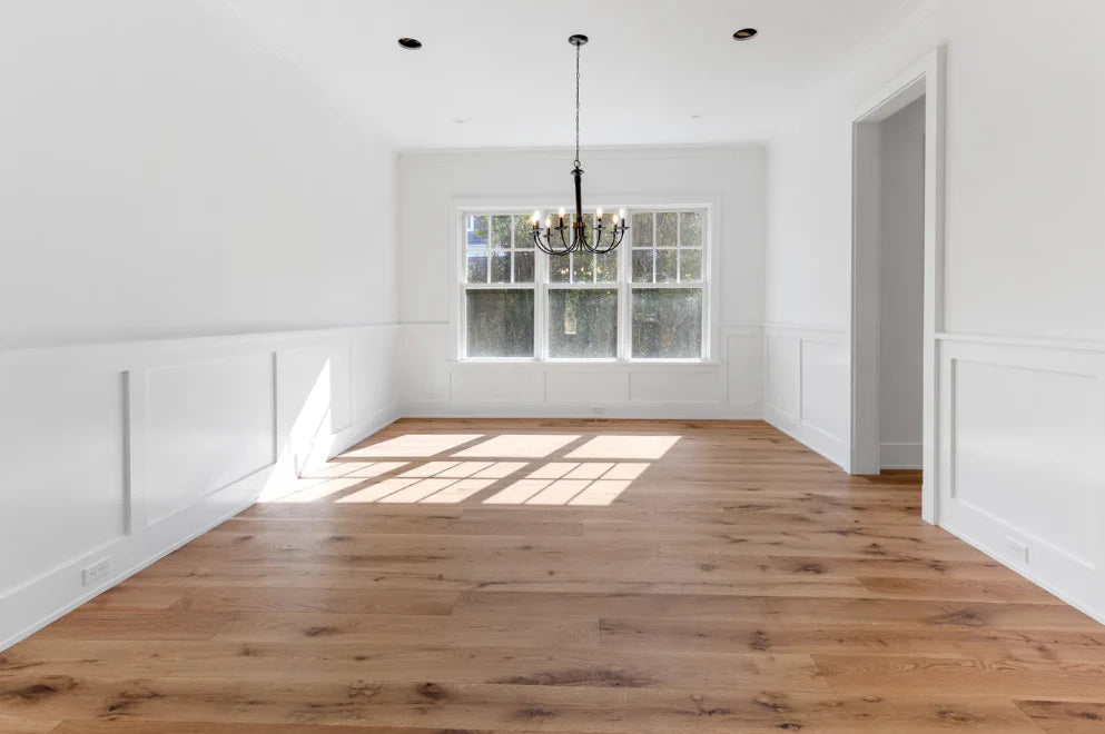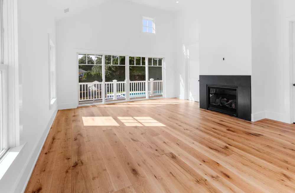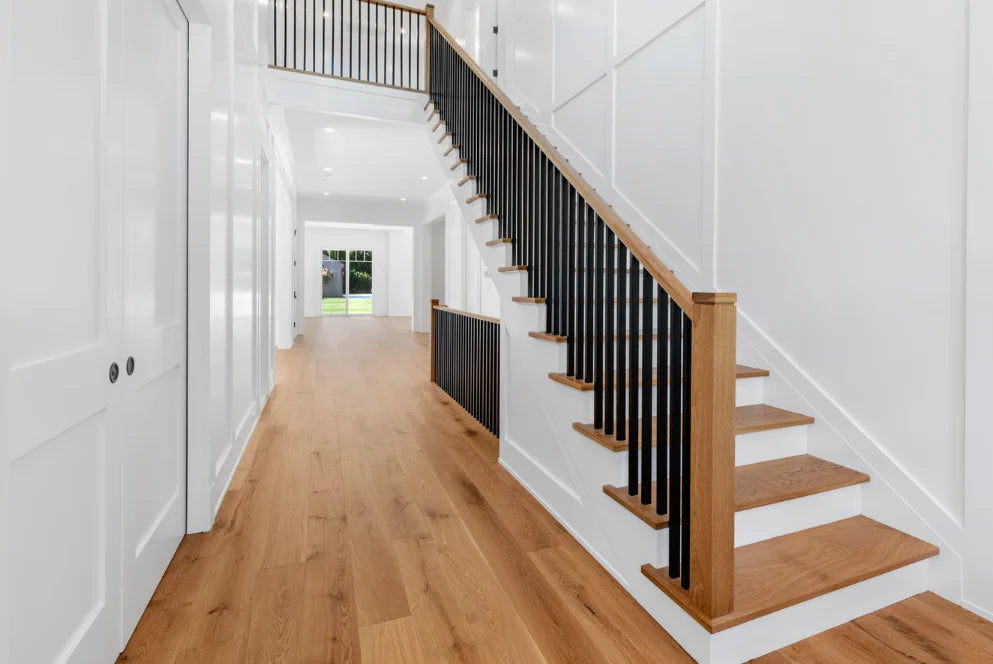 This home was designed and built by BJC Luxury Homes. The bright walls and emphasis on natural lighting pair perfectly with our 8" White Oak Live Sawn Natural hardwood floors.