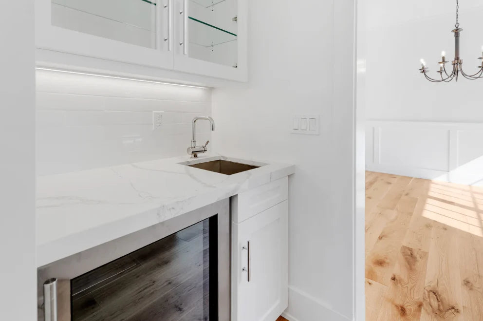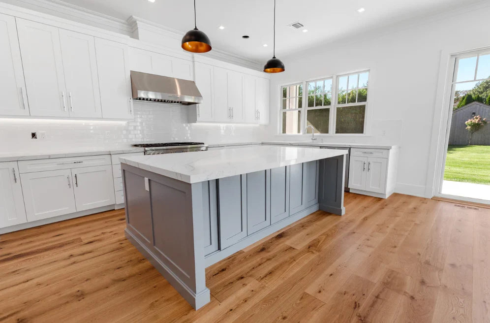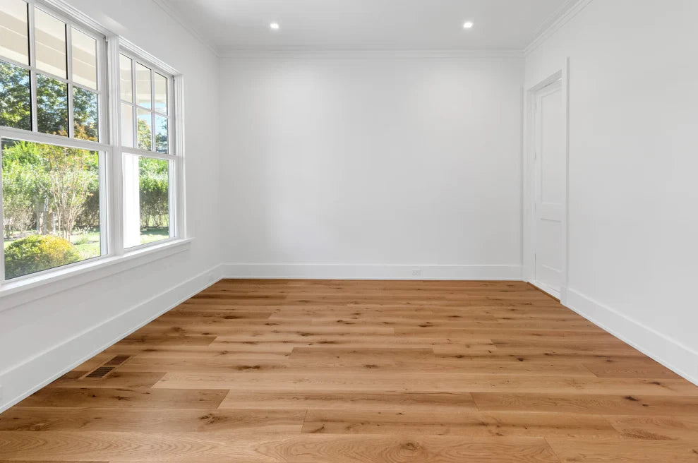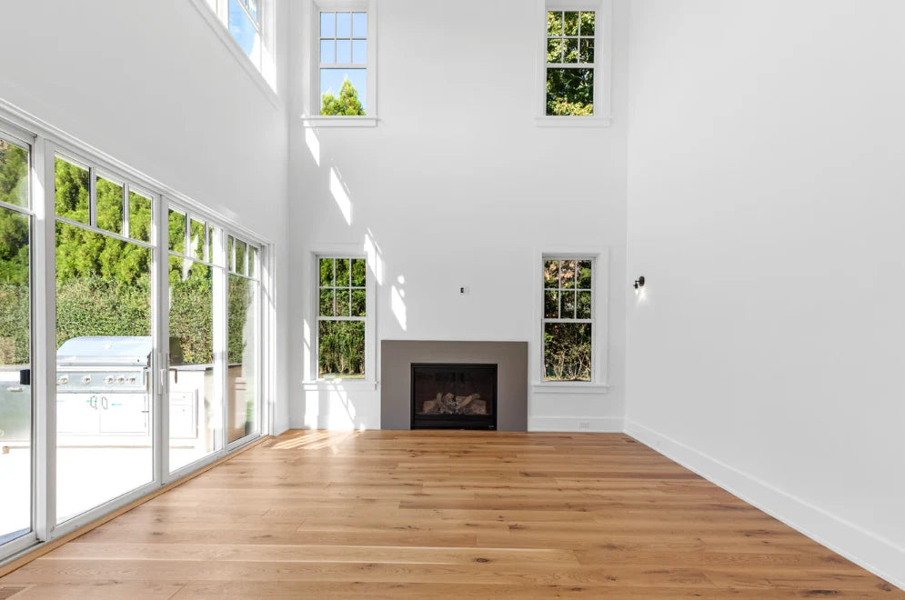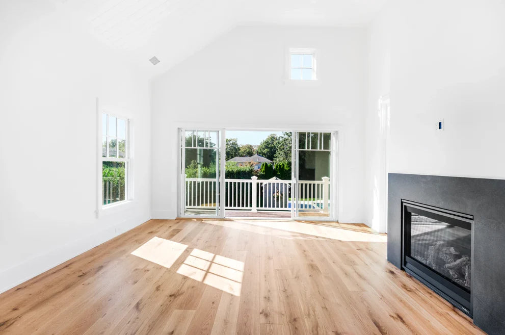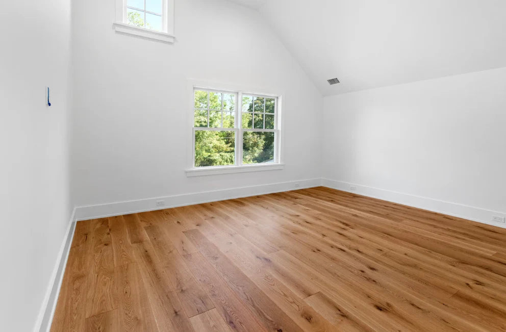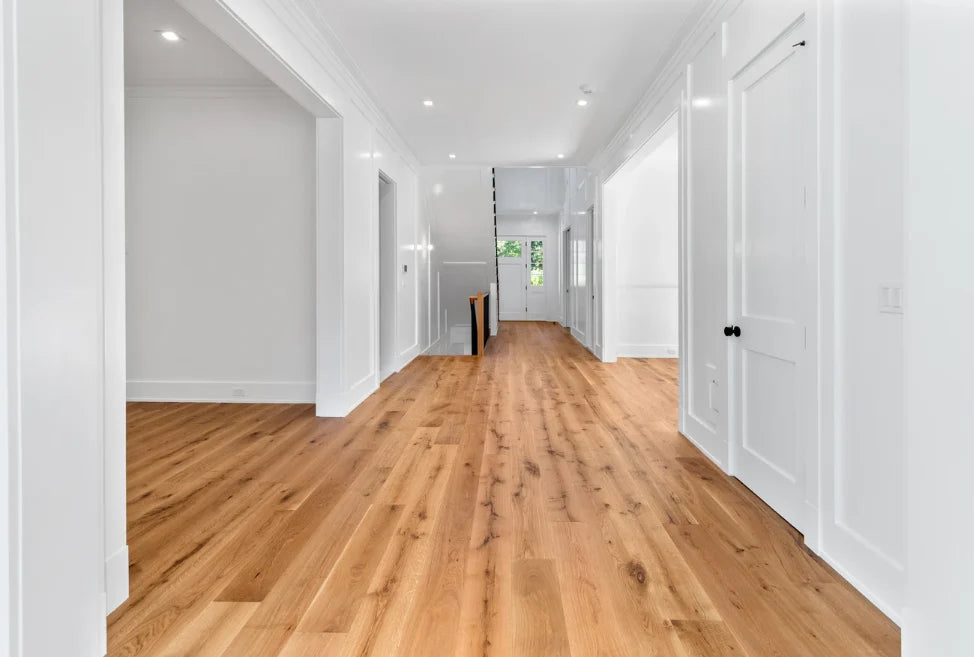 This home was designed and built by BJC Luxury Homes. The bright walls and emphasis on natural lighting pair perfectly with our 8" White Oak Live Sawn Natural hardwood floors.